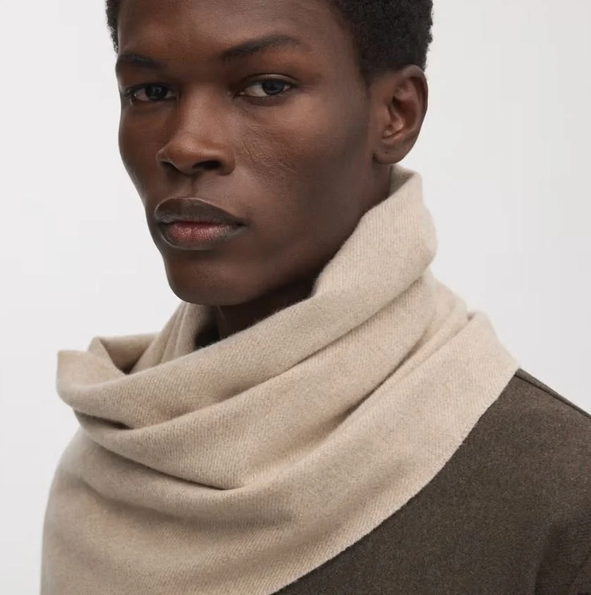 55% recycled wool, 45% recycled cashmere. A substantial, soft and warm felted wool-blend scarf. Spun, woven and cut in Italy.